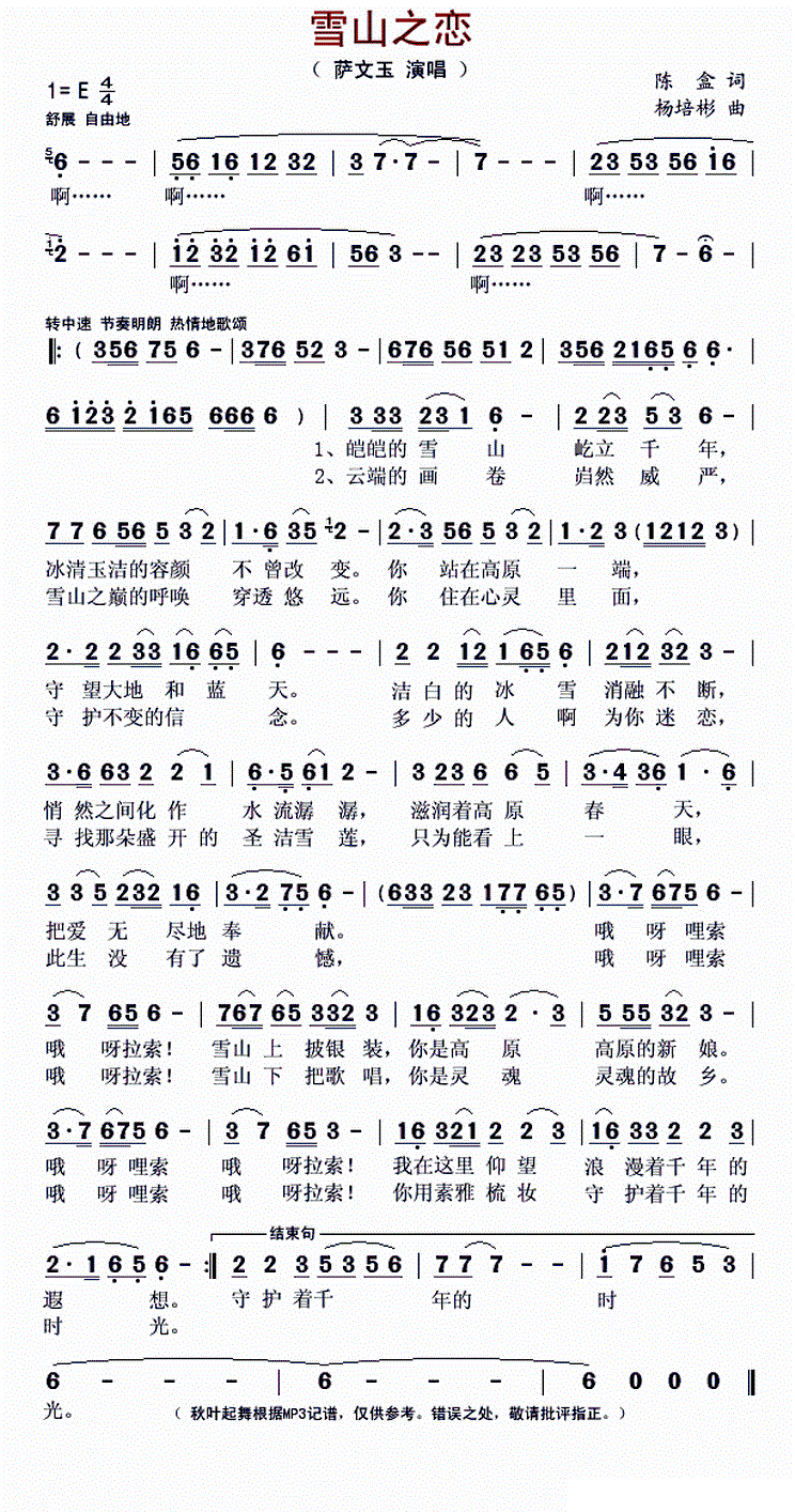 - [歌谱] 雪山之恋