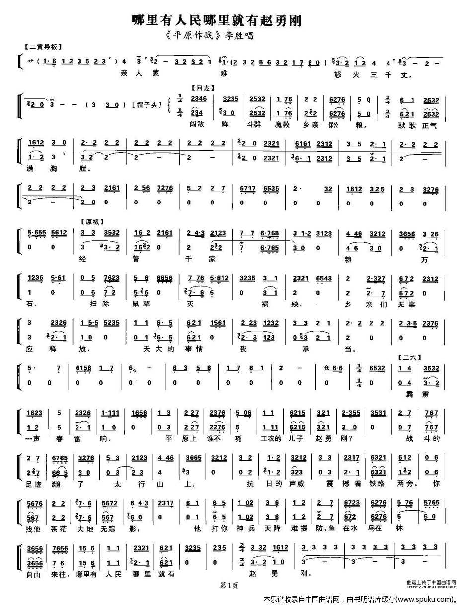 哪里有人民哪里就有赵勇刚 平原作战 李胜唱段 琴谱