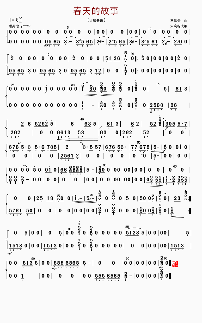 - [分谱,古筝谱] 春天的故事 古筝