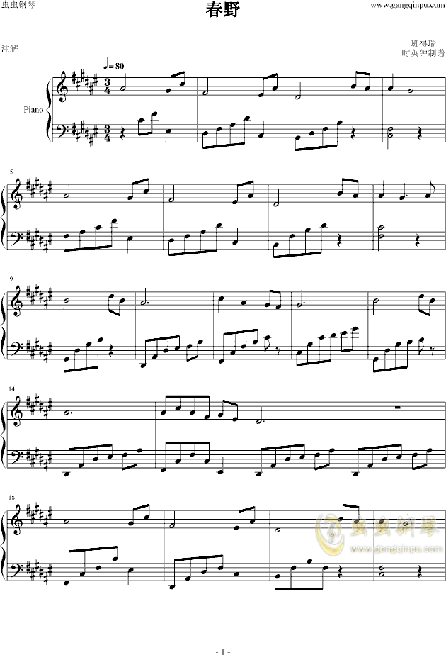 - [钢琴谱,歌谱] 春野 班得瑞
