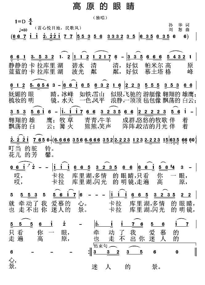 - [歌谱] 高原的眼睛 卡拉库里湖之歌