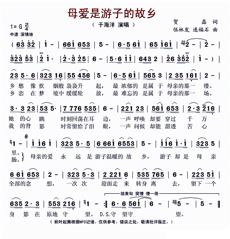 - [歌谱] 游子的故乡