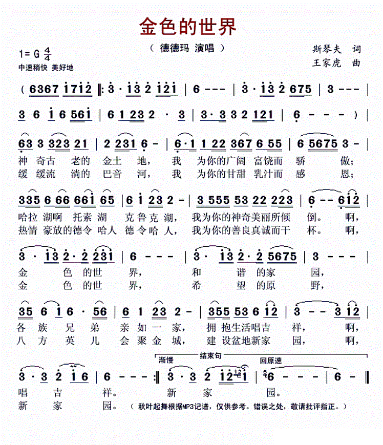 - [歌谱,葫芦丝谱] 金色的孔雀