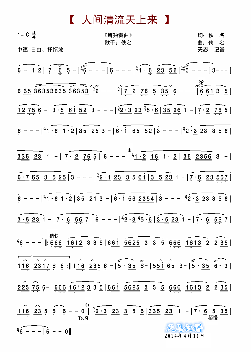 - [箫谱] 人间清流天上来 箫独奏曲