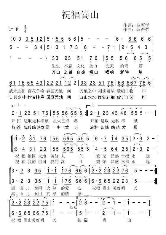- [歌谱] 中国嵩山征歌应征合作作品 天地之中有座嵩山