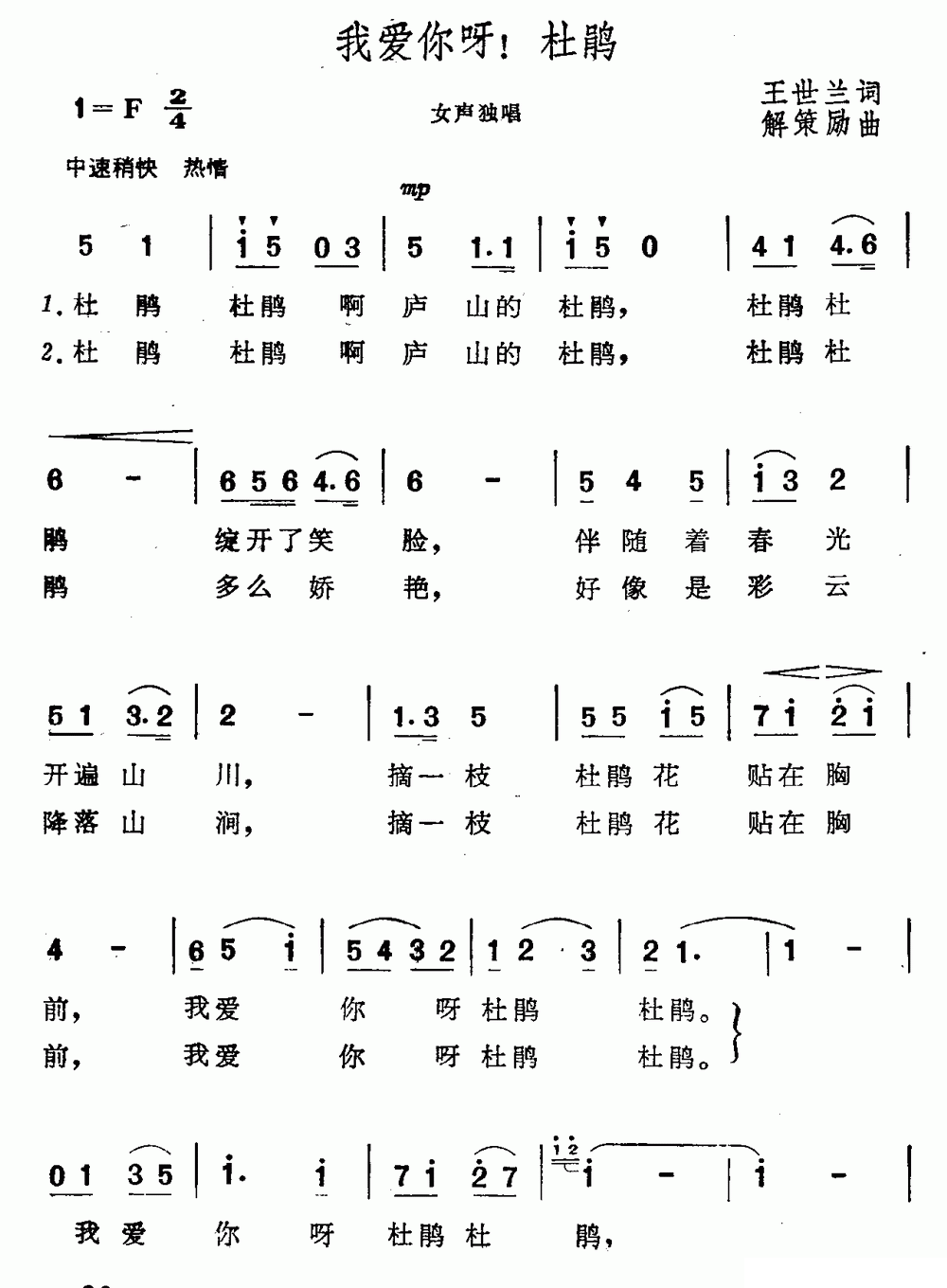 - [歌谱] 我爱你呀 杜鹃