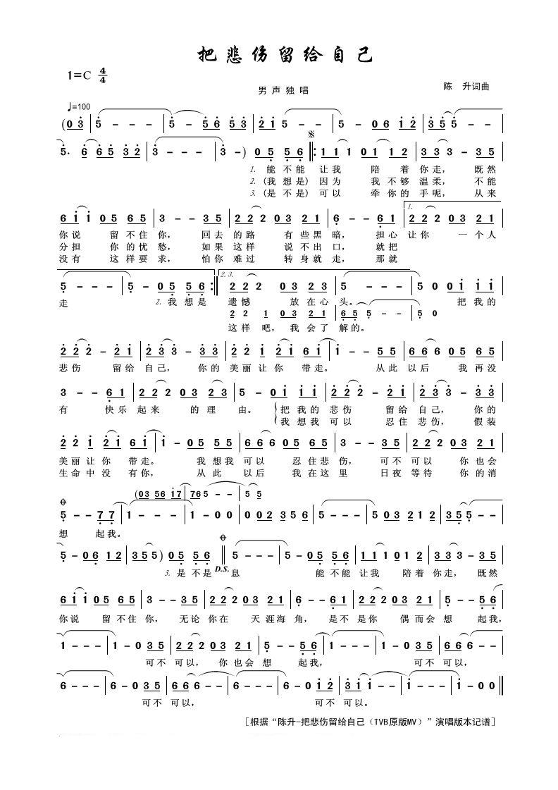 把悲伤留给自己 陈升 和弦