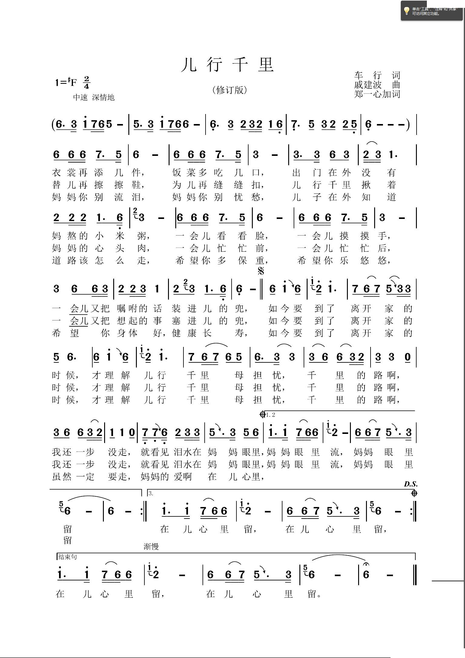 - [歌谱] 儿行千里