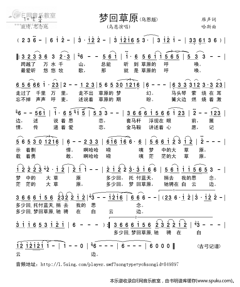- [歌谱] 梦回草原 仁钦敖日布词曲