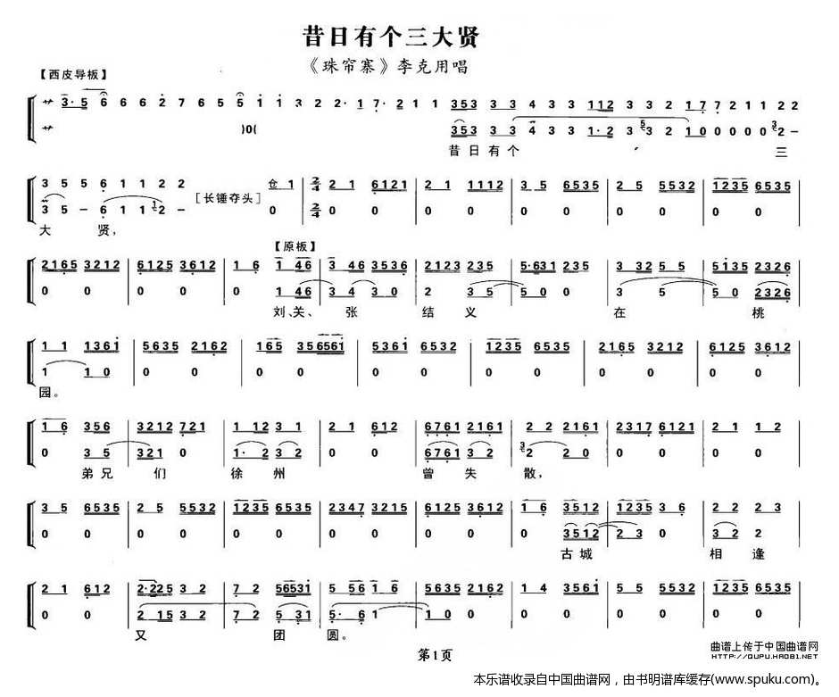 昔日有个三大贤 珠帘寨 李克明唱段 琴谱