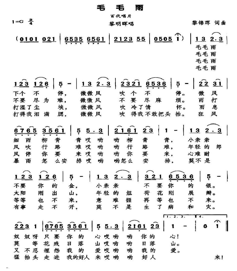 - [歌谱] 毛毛雨 情深深雨蒙蒙 专辑歌曲