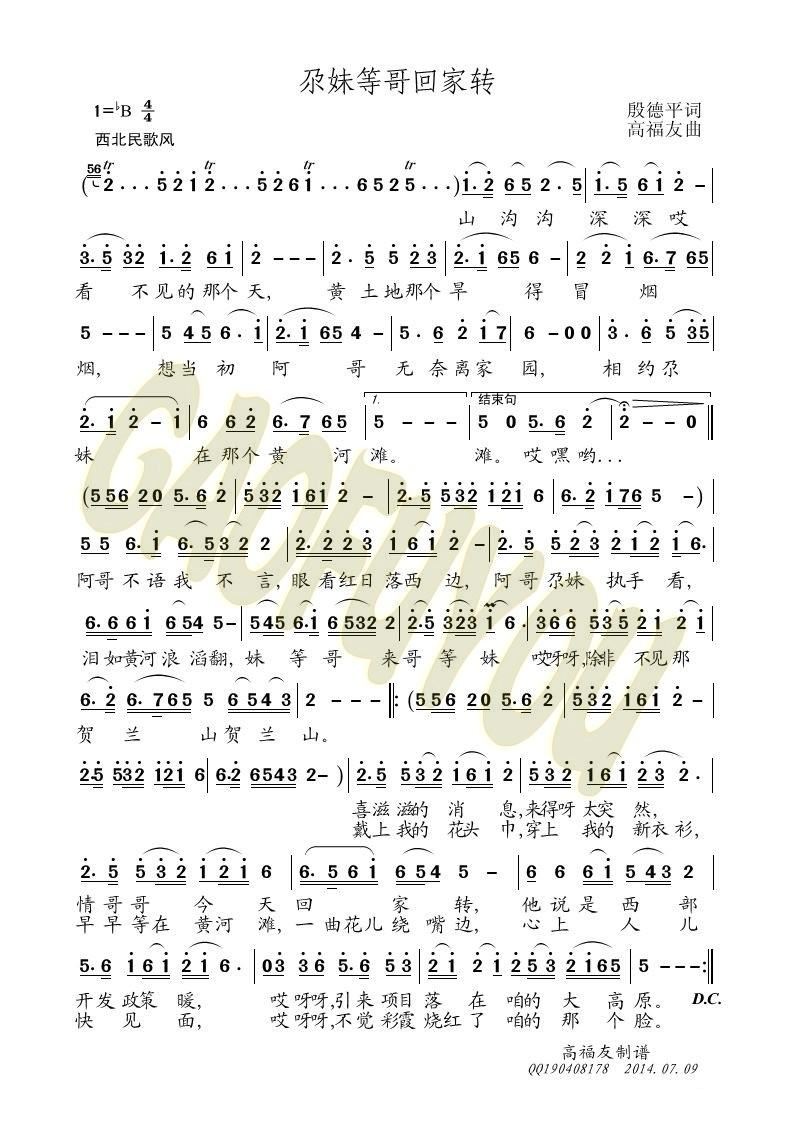 - [二胡谱,歌谱] 回族尕妹我的花儿